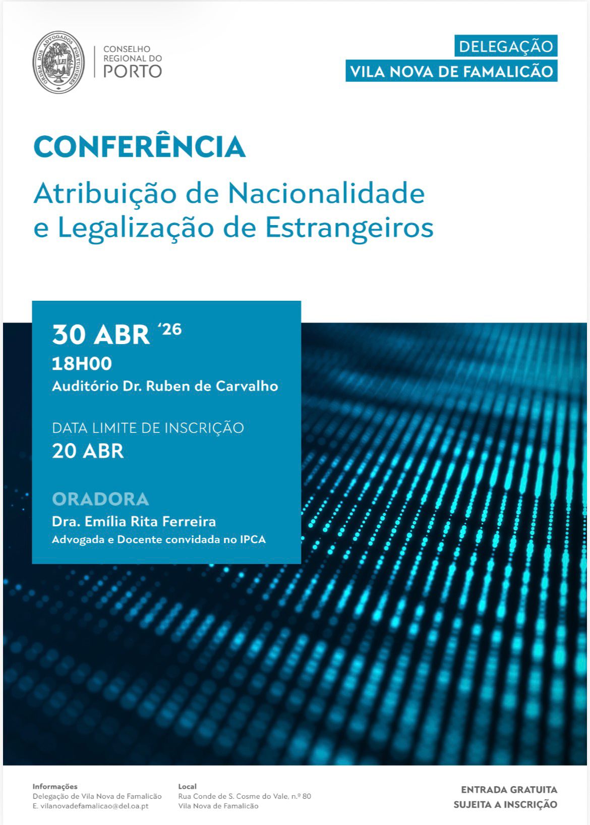 A conferência terá lugar no dia 30 de abril de 2026, pelas 18h00, no Auditório Dr. Ruben de Carvalho, em Vila Nova de Famalicão.